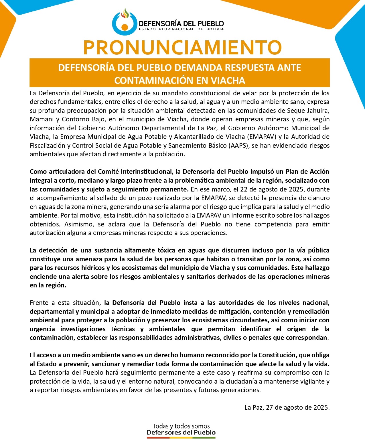 Como articuladora del Comité Interinstitucional, la Defensoría del Pueblo impulsó un Plan de Acción integral a corto, mediano y largo plazo frente a la problemática ambiental de la región, socializado con las comunidades y sujeto a seguimiento permanente. En ese marco, el 22 de agosto de 2025, durante el acompañamiento al sellado de un pozo realizado por la EMAPAV, se detectó la presencia de cianuro en aguas de la zona minera, generando una seria alarma por el riesgo que implica para la salud y el medio ambiente. Por tal motivo, esta institución ha solicitado a la EMAPAV un informe escrito sobre los hallazgos obtenidos. Asimismo, se aclara que la Defensoría del Pueblo no tiene competencia para emitir autorización alguna a empresas mineras respecto a sus operaciones.